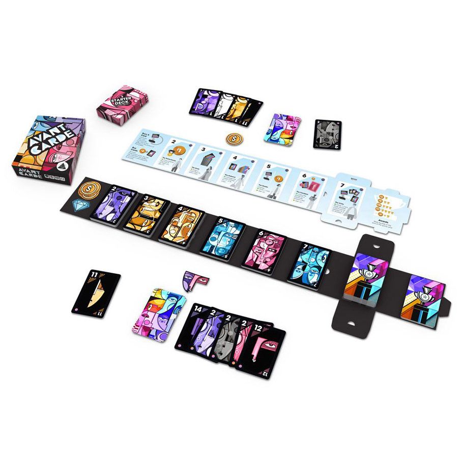 In Avant Carde, you want to build a collection of stunning cubist artwork. Each player starts with a deck of ten so-so cards: 1s and 2s in six colors that don't match and four high-value cards, each in a different color. Each player draws a hand of seven cards, then puts on the best exhibition possible by matching colors and numbers, e.g. red 11, red 1, purple 1, purple 13.