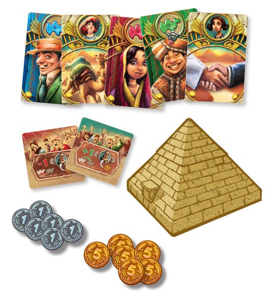 In Camel Up, up to eight players bet on five racing camels, trying to suss out which ones will place first and second in a quick race around a pyramid. The earlier you place your bet, the more you can win — should you guess correctly, of course. Camels don't run neatly, however, sometimes landing on top of another one and being carried toward the finish line. Who's going to run when? That all depends on how the dice come out of the pyramid dice shaker, which releases one die at a time when players pause from their bets long enough to see who's actually moving!