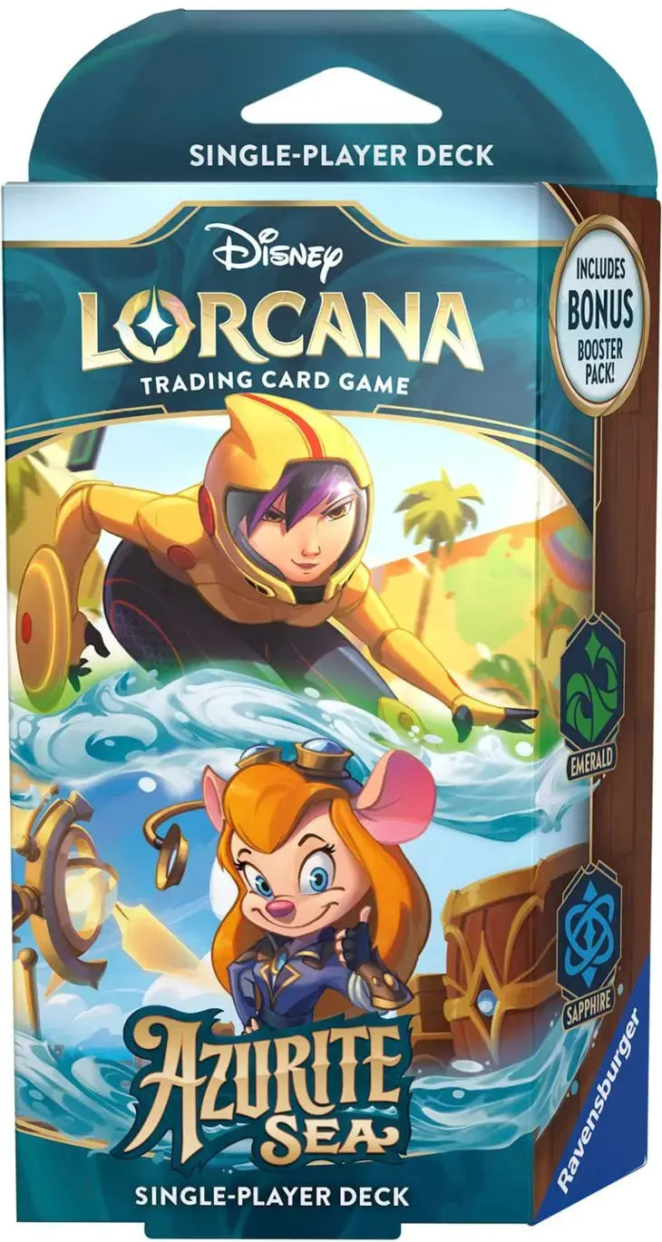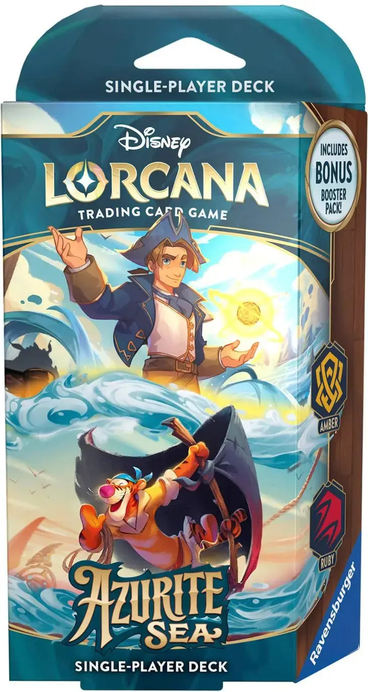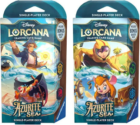 Each Disney Lorcana TCG single player deck includes everything a player needs to start playing against another player who has their own deck. Through these decks, players get a taste of the rich story and varied characters of the Disney Lorcana TCG. Two single-player starter decks are available for the Disney Lorcana TCG set Azurite Sea. Each prebuilt deck has 60 cards and features cards from two inks, each with distinct play styles. The two ink combinations are Amber & Ruby and Emerald & Sapphire.