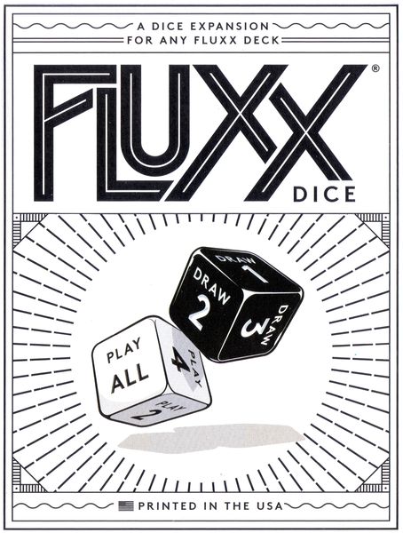 Fluxx Dice is an expansion that can be used with any Fluxx card game. The components are two dice — one showing "Draw 1", "Draw 2", etc. while the other shows "Play 1", "Play 2", "Play All", etc. — and five cards. Instead of following the basic Fluxx rules, each turn players roll the draw and play dice, then follow the new rules set by their roll!