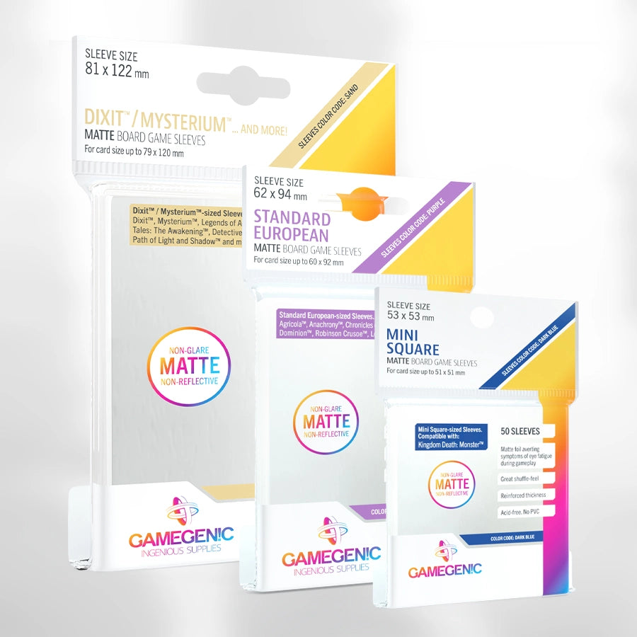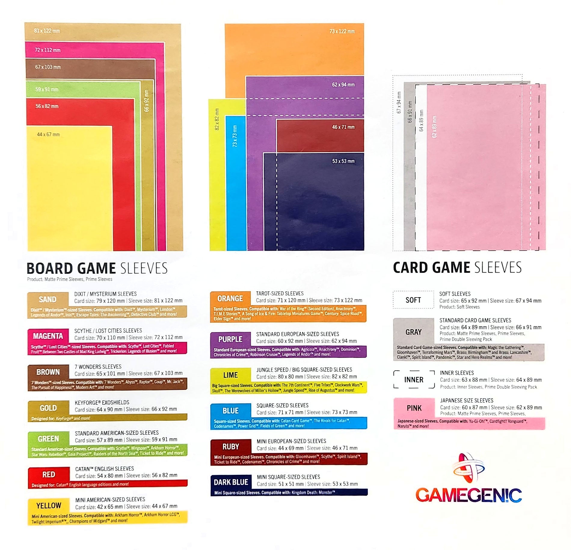 The well-known and established Sleeve Color Codes by Fantasy Flight Games™ are continued in this product line. Players will recognize the proven color system and find new sizes with new color codes