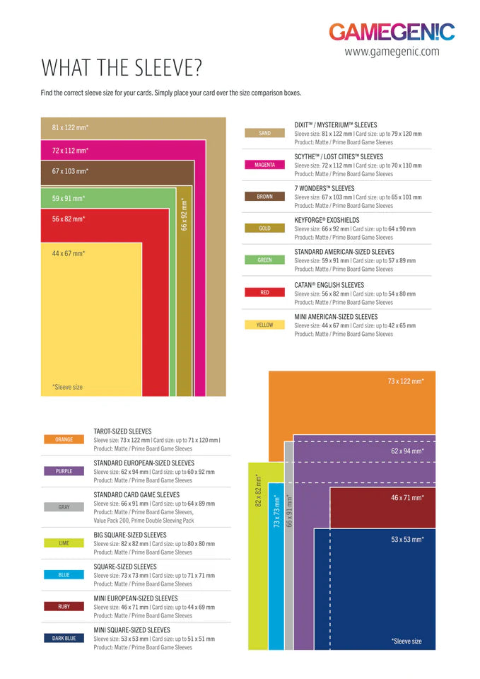 The well-known and established Sleeve Color Codes by Fantasy Flight Games™ are continued in this product line. Players will recognize the proven color system and find new sizes with new color codes