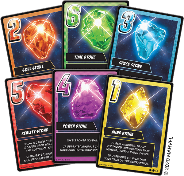 Throughout the game, players take turns drawing a card and playing a card, then executing its effect. Hero players can call upon the likes of Iron Man, Spider-man, Thor, and Scarlet Witch for their abilities to battle and gather intel about their opponent’s schemes. A worthy adversary, Thanos plays with a two-card hand, drawing from his own deck of minions and powerful Infinity Stones. The heroes will have to use their abilities in strategic combinations to knock his health down to zero before he can do the same to them—or find all six Infinity Stones and win with a snap of his fingers. Who will prevail in this battle for the universe?