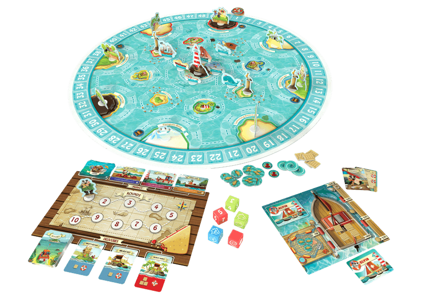 Choose to roll fast dice and risk attracting enemies like Pirates and sharks, or play it safe and choose to roll slow dice.