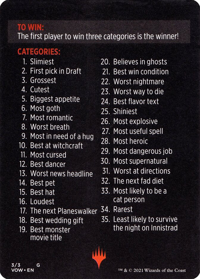 The Judge chooses a category from the list on the back of this card (either their favorite or at random). The other players each secretly submit a card from their pack that they think fits the category.