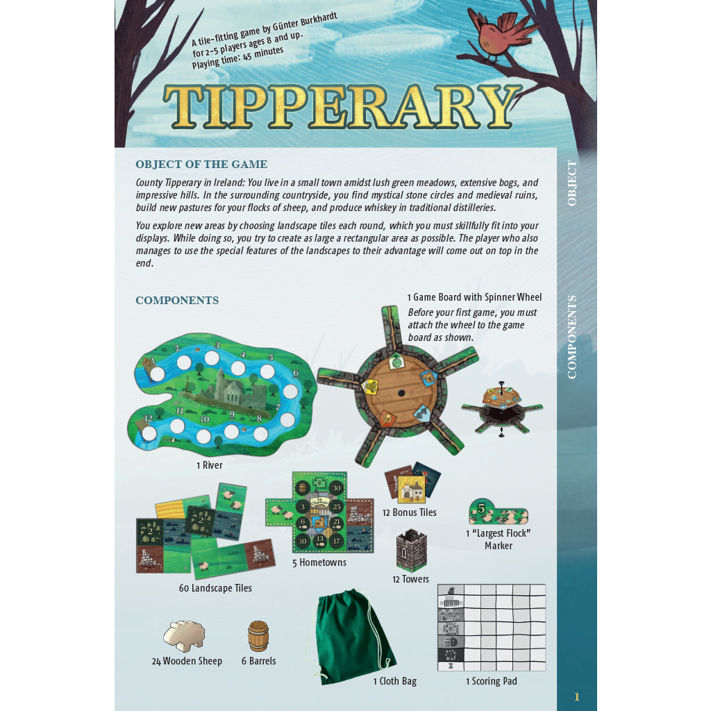 The linchpin is a "magic stone circle" that decides which of the tiles you can choose from. If you combine them skilfully, you will eagerly collect sheep, castles and whiskey for more victory points. After 12 rounds, one player is master of Tipperary.