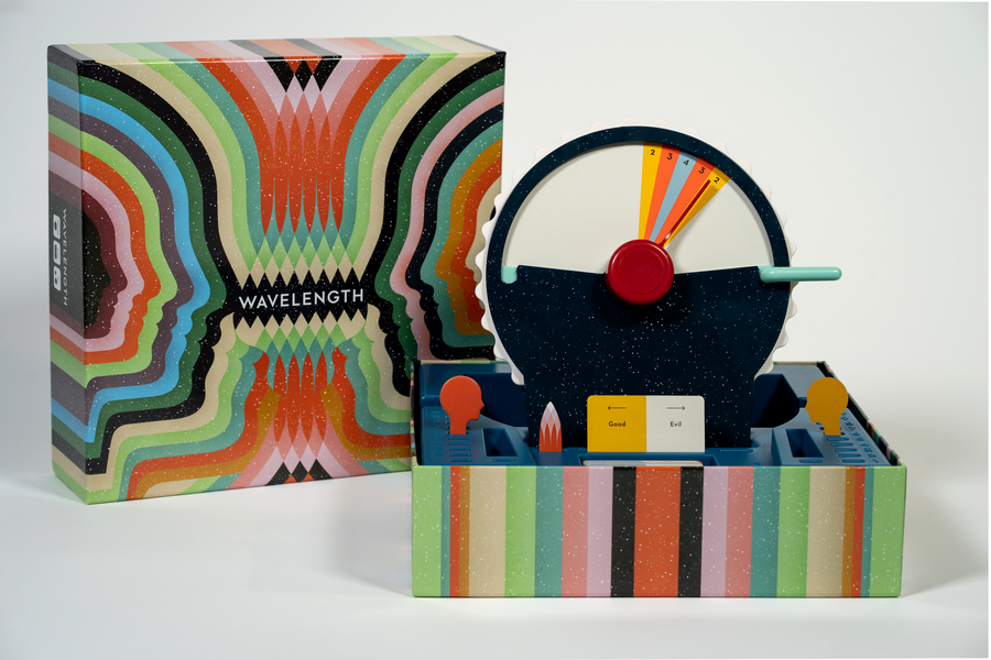 Wavelength is a social guessing game in which two teams compete to read each other's minds. Teams take turns rotating a dial to where they think a hidden bullseye is located on a spectrum. One of the players on your team — the Psychic — knows exactly where the bullseye is, and draws a card with a pair of binaries on it (such as: Job - Career, Rough - Smooth, Fantasy - Sci-Fi, Sad Song - Happy Song, etc). The Psychic must then provide a clue that is *conceptually* where the bullseye is located between those two binaries.